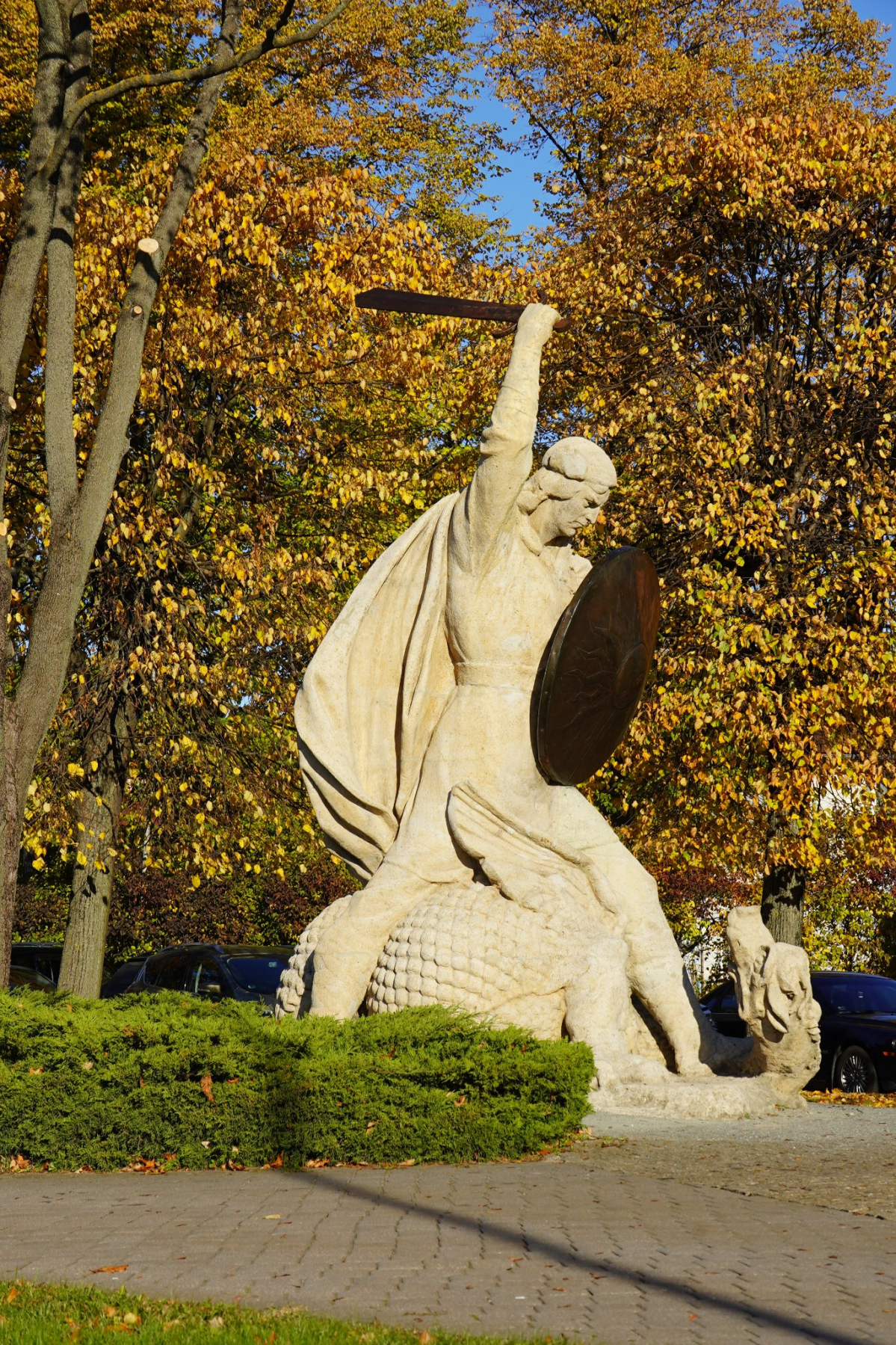 Skulptuur „Lāčauša cīņa ar pūķi“ (Karupoja võitlus draakoniga) (1956) on üks tuntumaid Majori väljaku keskkonnaelemente Jūrmalas, mille autorid on skulptorid Leonīds Kristovskis ja Vladimirs Rapiķis. Figuraalne kompositsioon on valatud betoonist, millele on lisatud kivitolmu, et saavutada loodusliku materjali mulje. Vasest mõõga ja kilbi valmistas tuntud korvpallur Jānis Krūmiņš, kes hakkas tegelema metallitööga skulptorite Inese Krūmiņa ja Vladimirs Rapiķis töökojas. Huvitav fakt – algselt kavatsesid skulptorid kujutada Püha Jüri, kuid pärast tellimuse tühistamist muutus kuju Lāčplēsiseks (Karupeksja), odaga asendati mõõk. Skulptuur toimis kunagi ka purskkaevuna, mida täiendasid neli dekoratiivset konna ja draakoni suust väljavoolav veejuga.