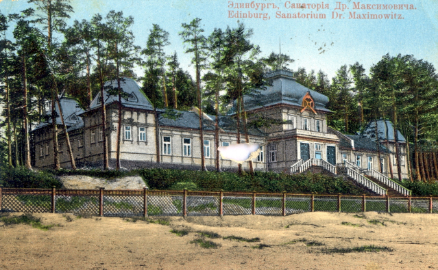 The spa and sanatorium quickly gained positive fame, increasing the popularity of Rīgas Jūrmala as a resort. This was the first sanatorium in Rīgas Jūrmala, which worked all year round. The water healing center offered sea water, sulfur water and mud baths, massages, exercise classes, Charcot showers, electric treatments. In 1913, doctor Maksimovičs established the Rīgas Jūrmala Society of Doctors, the purpose of which was to study the effects of seaside healing factors on the human body, contributing to the development of the Rīgas Jūrmala resort. After the death of M. Maksimović in 1923, the sanatorium continued its operation under the name "Edinburgh". After the Second World War, several wooden buildings were used for the construction of the "Baltija" sanatorium. Currently, the remaining buildings are privately owned.