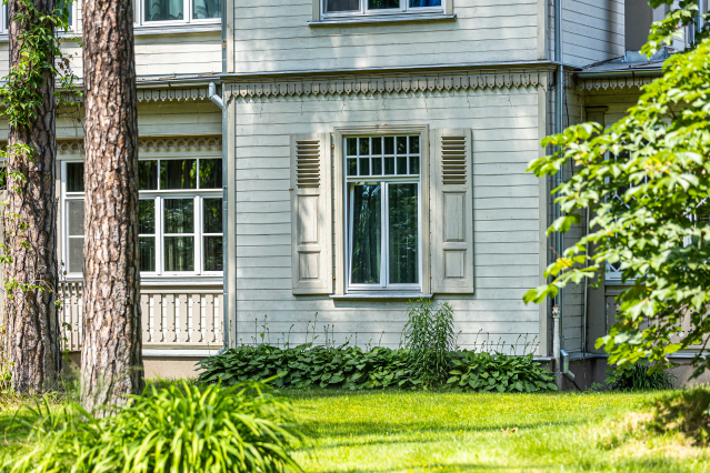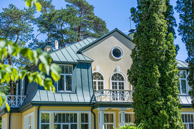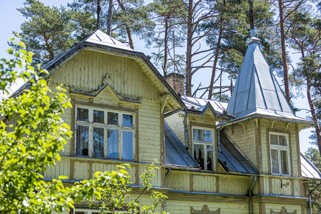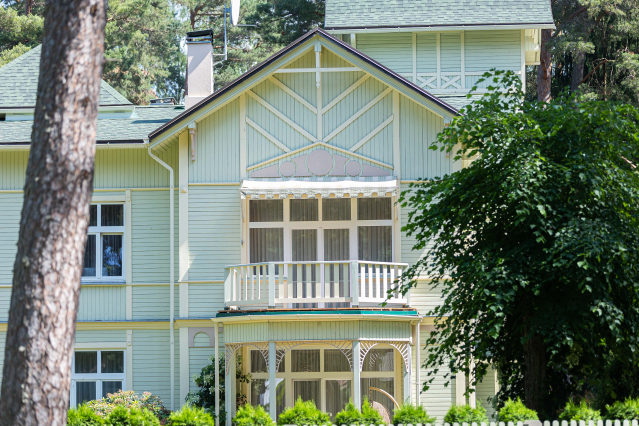 The unique building in Neogothic style is an architectural and cultural monument of the national importance. It was built in 1880-1883 by the notable Latvian patron, construction contractor Kristaps Morbergs. The cottage and the garden were built in an undeveloped pine forest at the time. Morbergs used construction materials left over from the construction of other buildings he designed, but he used a layer of pine needles to insulate the walls. The wooden summerhouse is sheathed with metal plates, probably the oldest window glass in Latvia can be seen in the windows. Once upon a time, the pride of the garden was a pool decorated with a sculpture – a boy with a swan – but it has disappeared over time. Now the pool is replaced by a rose bed. The cellar created in the corner of the plot may once have been used for the cultivation of champignons. In Soviet times, the popular "Balsam bar" operated there. During the Soviet era, the library of the sanatorium named after Maxim Gorky was established here. In the 1970s, a dormitory was built from bricks instead of a greenhouse and an orchard. According to Kristaps Morberg's will, the complex belongs to the University of Latvia. In 2008, the University of Latvia restored the summer house complex - summer house, conservatory, wine cellar, utility building, caretaker's and manager's house - according to the project of architect Pēteris Blūms. Inside you can see the magnificent interior of the building, including Albert Hogarth's ceiling painting from 1893, hand-drawn wallpaper restored after old models, original doors and pot stoves. This is one of the most outstanding restoration works in Latvia.