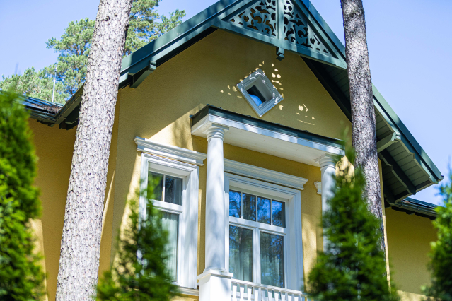 The buildings are a monument of national importance and one of the rare examples of construction of fishermen's houses in Jūrmala, where the entire historical substance has been used in the renovation. The reconstruction of the building won the 1st prize in the Jurmala Historical Architecture Award in 2023. The building, built in 1910, is evidence that Jurmala, including the part of the city where elegant villas and guesthouses have been lined for more than a century, was once a simple fishing village. Today, it is hard to imagine that fishing boats and nets were visible all along the sea coast, herring drying houses stood in the dune forest, and the construction consisted of heavy plank buildings. The building is a typical example of such an evolution. The fishermen's houses - the main building and the outbuilding with the summer kitchen - have 7.5 cm thick wooden plank walls. Over time, the buildings have been functionally and visually adapted to the needs of summer residents. A fine-grained veranda has been built for the holiday home, while the open porch is decorated with wooden slats. The arrangement of diagonal grids is the oldest method of decorative design of open columns. The delicate wooden grid on the restrained facade facing the street, painted with linseed oil colors, still acts as an expressive accent today.