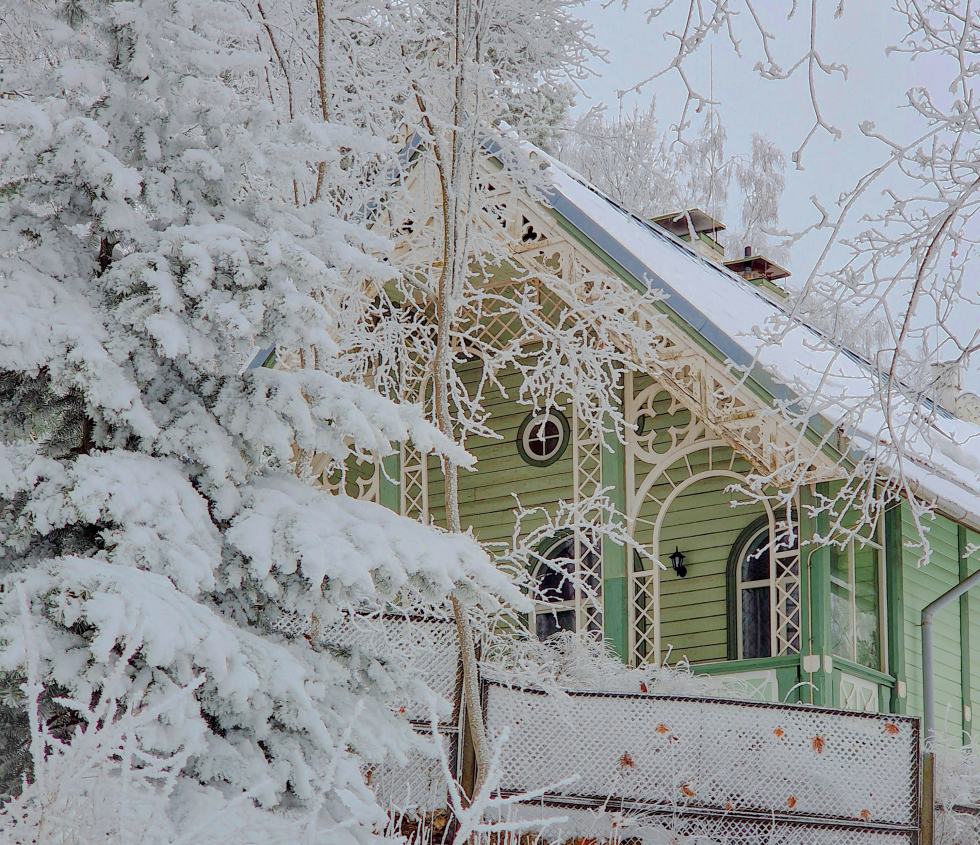 In winter, when the curtain of tree foliage has completely fallen, the facades of Jurmala's traditional wooden architecture open up to view. Every pattern carved into the window shutters, the ornament of the gable, the floral motif in the spire, the turret and the weather vane clearly demonstrate their delicacy. The blue, red and white squares of the glazed verandas are then almost the only color accents in the uniformly white and gray winter.