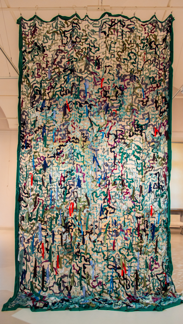 Evija Stukle-Zuitiņa. Lėtas traukinys, 2024 (tekstilės mozaika, siuvinėjimas, mezgimas)