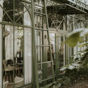 Jūgendstila arhitektūras iedvesmotais viesnīcas Villa Joma paviljons ar rūpīgi veidotiem metāla rotājumiem, grezniem stikla paneļiem un kupolveidīgo jumtu ar delikāti izliektajām metāla līnijām rada elegantu un romantisku noskaņu, kas ir ideāli piemērota kāzu fotosesijām. Paviljona zaļganais tonis harmonizē ar apkārtējo dārzu, un tā gaisīgā konstrukcija piešķir fotogrāfijām vieglumu un harmoniju. Šo lokāciju var efektīvi fotografēt gan dienas, gan krēslas stundās, izmantojot dabiskās gaismas radītās ēnas un atspulgus stiklā, kas papildina vizuālo dziļumu un pastiprina atmosfēru.