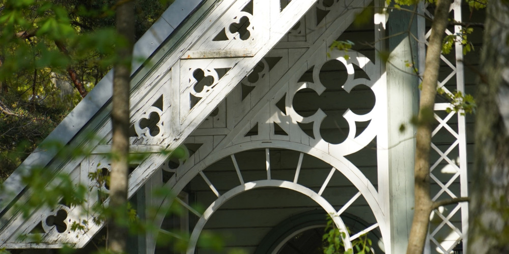 Ieskaties: Vasarnīca izceļas ar simetriskām, stiklotām verandām abos stāvos, kas izvietotas ēkas galos un piešķir tai līdzsvarotu siluetu. Jumta pārkare ar kokgriezuma ornamentiem veido bagātīgu dekoratīvo noslēgumu.