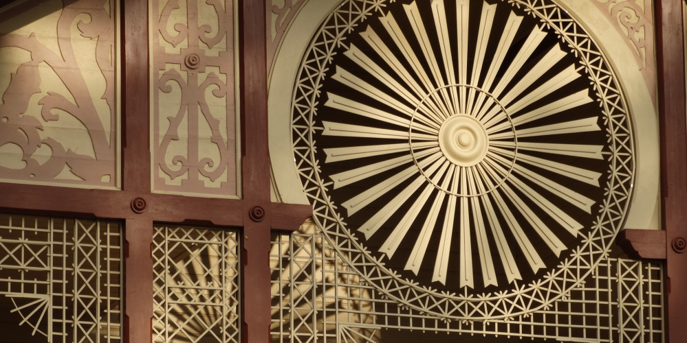 Ieskaties: Ēka izceļas ar dekoratīvi noformētiem pusaploces logiem un saulītes motīvu.