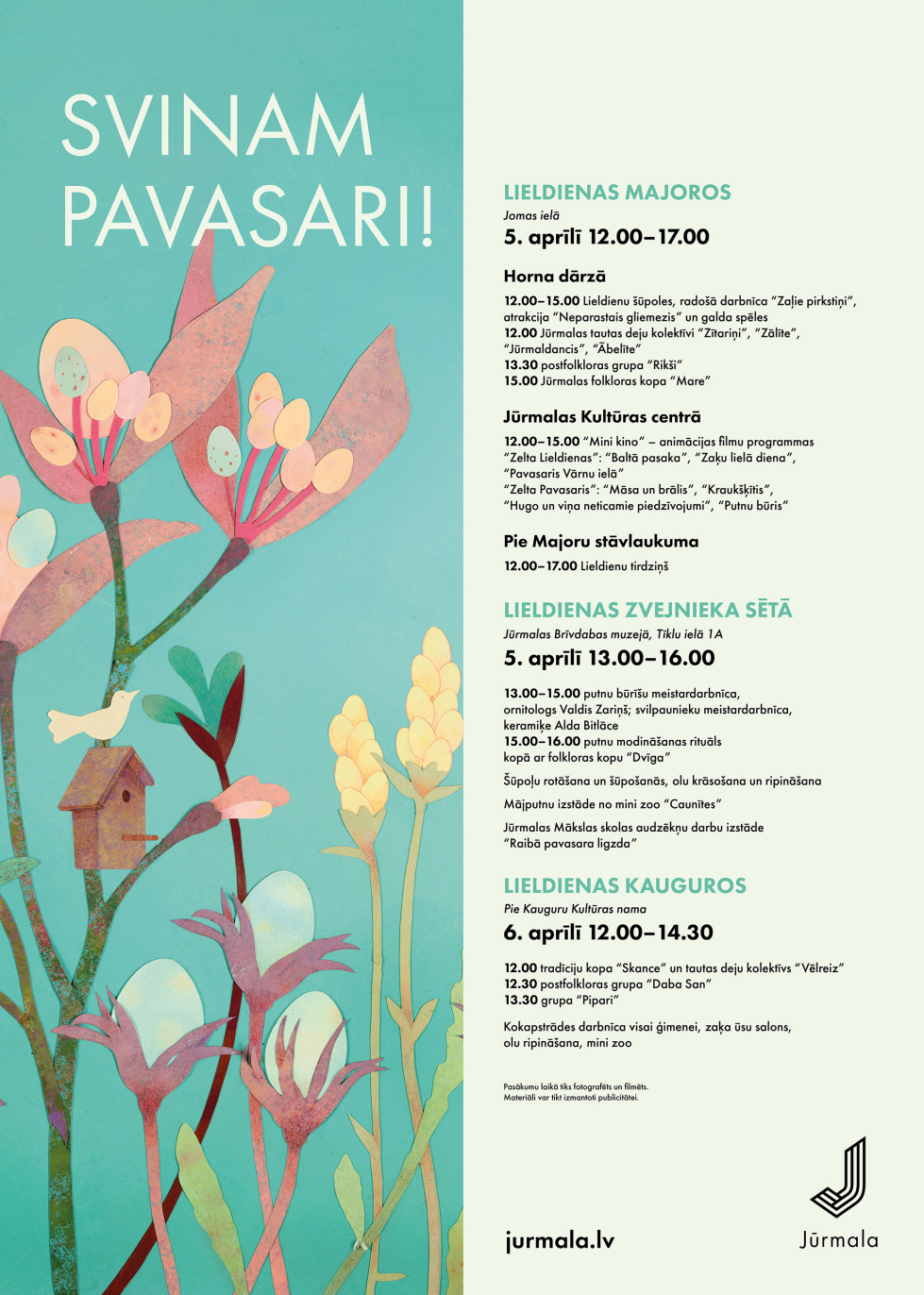 Majoros svētki notiks Jomas ielā un Horna dārzā — ar šūpolēm, radošajām darbnīcām, galda spēlēm un koncertiem. Uz skatuves līdzās Jūrmalas deju kolektīviem un folkloras kopām uzstāsies arī latgaliešu postfolkloras grupa “Rikši” – viena no atpazīstamākajām šī žanra grupām Latvijā. Tās skanējumu veido akordeons, vijole, basģitāra, mandolīna un bungas, radot enerģisku, laikmetīgu folkloras interpretāciju ar izteikti latgalisku temperamentu. Jūrmalas Kultūras centrā paralēli būs pieejama animācijas filmu programma bērniem – rotaļīgas, viegla humora un pavasarīgas noskaņas pilnas latviešu animācijas filmas. Majoru stāvlaukumā notiks Lieldienu tirdziņš.