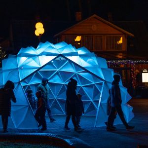 Dzintari metsapark erilise valguskujunduse – valgustatud rajad, tähemotiivid ja mänguline dirižabli siluett kutsuvad rahulikule talveõhtu jalutuskäigule.