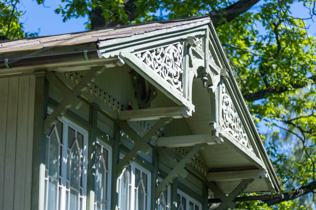 The building was built in 1920 as a summer house. An architectural monument of national importance. It features interesting glazed verandas on both sides of the two-story house and ornate wood carvings on the roof overhang.