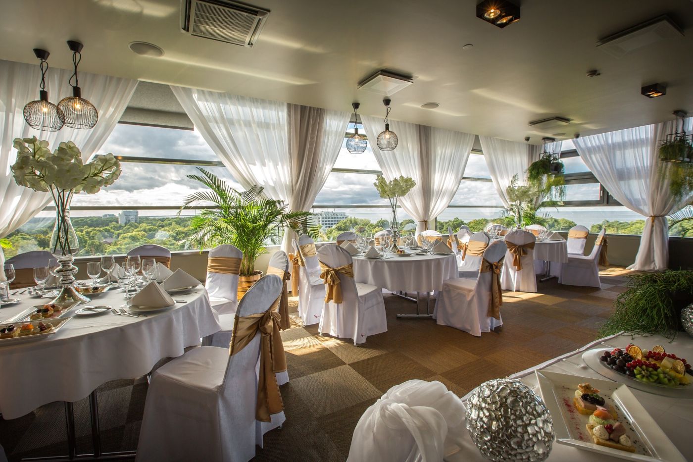 - Svinību zāle “Panorāma” desmitajā stāvā ar plašiem logiem un terasi, kas paver lielisku skatu uz simtgadīgajām priedēm, Jūrmalas pilsētu un jūras līci, piemērota līdz 50 personām.