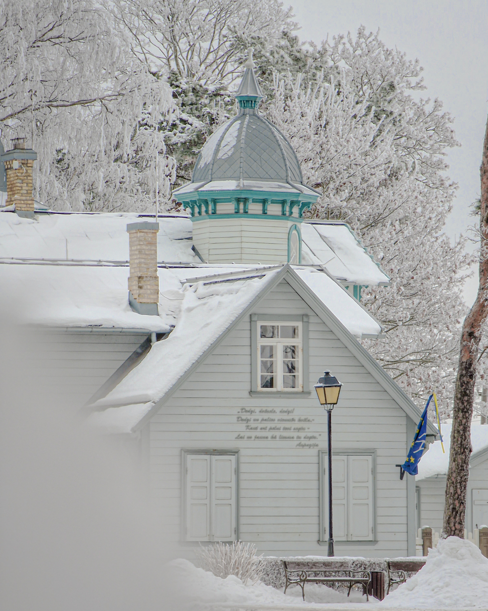 Ziemā, kad koku lapotnes aizkars ir pilnībā nokritis, skatam paveras Jūrmalas tradicionālās koka arhitektūras fasādes. Katrs logu slēģos izgrieztais raksts, jumtgales ornaments, ziedu motīvs savilcēs, tornītis un vējrādis uzskatāmi parāda savu smalkumu. Stikloto verandu zilie, sarkanie un baltie kvadrātiņi tad ir teju vienīgie krāsu akcenti ziemas baltās un pelēkās krāsas vienveidībā.